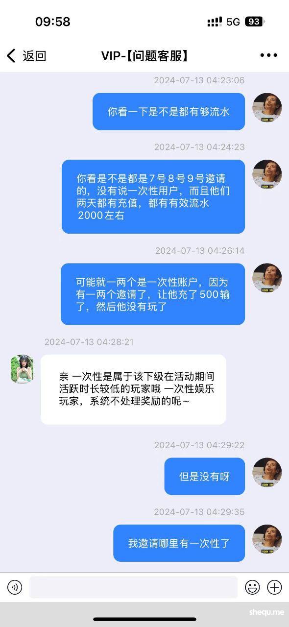 南宫黑人头费我在南宫邀请了15个有效新用户,大部分都是7号和8号9号邀请的,都有连续两天充值,并且达到了500以上,有效流水大部分都有2000以上有些5000,到现在结算的时候说我的是一次性用户,系统不给我发放礼金,全部给我黑了,一共22500元,我在6.10-6.20期间的17号也拉了一个人,他在18号充值和19号充值,总共流水1000,他的情况和我上面15个人的情况一模一样,但是他发放了礼金,到了另一个周期,我拉了15个人,现在却是以各种理由不给我发放礼金,大家看清南宫,不要去南宫拉人了,你拉人拉的多不会给你礼金发放的